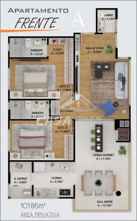 Área Global: 140,95m² | Área Privativa: 87,62m²
