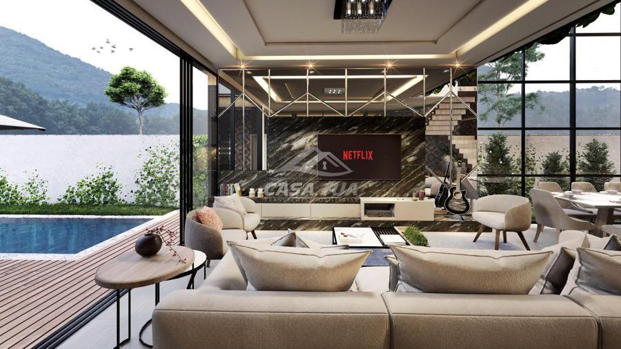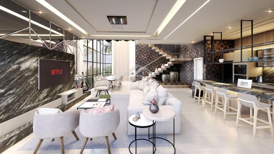sofisticação e elegância. Ambientes térreos totalmente integrados, com grandes aberturas, ideais para oferecer ótima iluminação natural e ventilação, além de conectar com a incrível área externa.