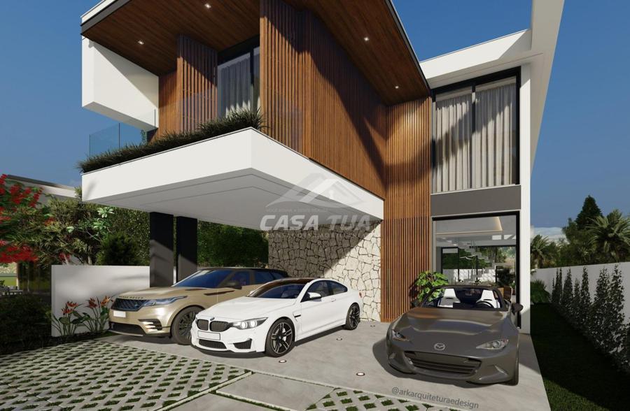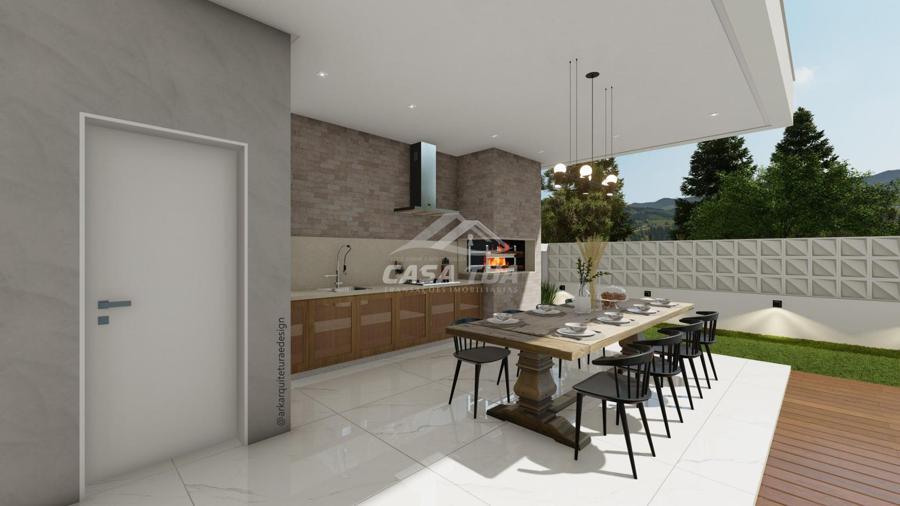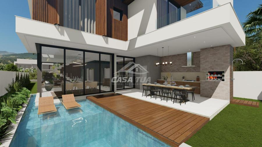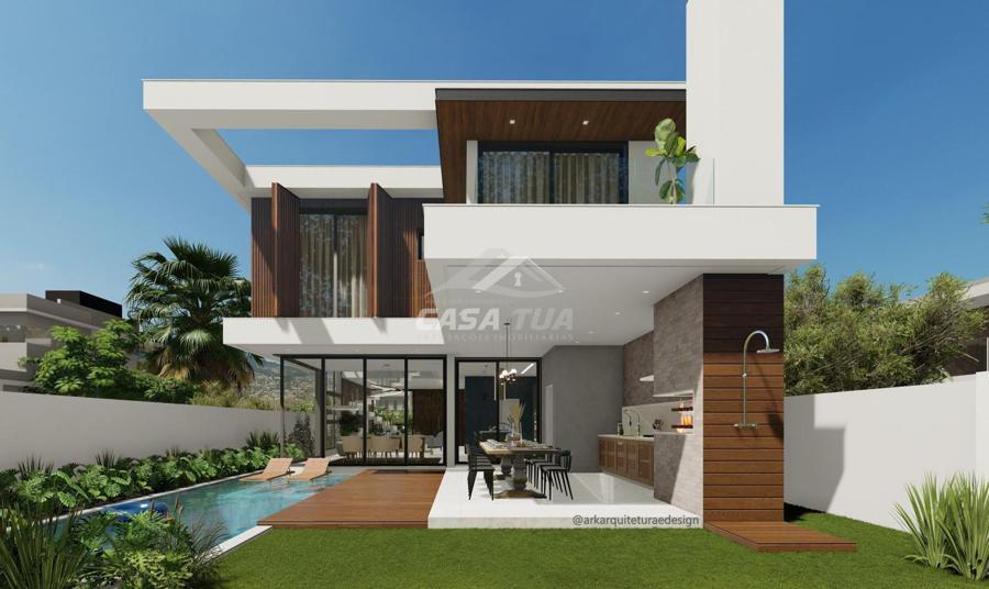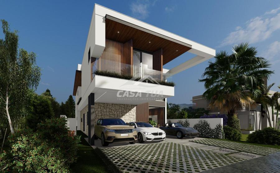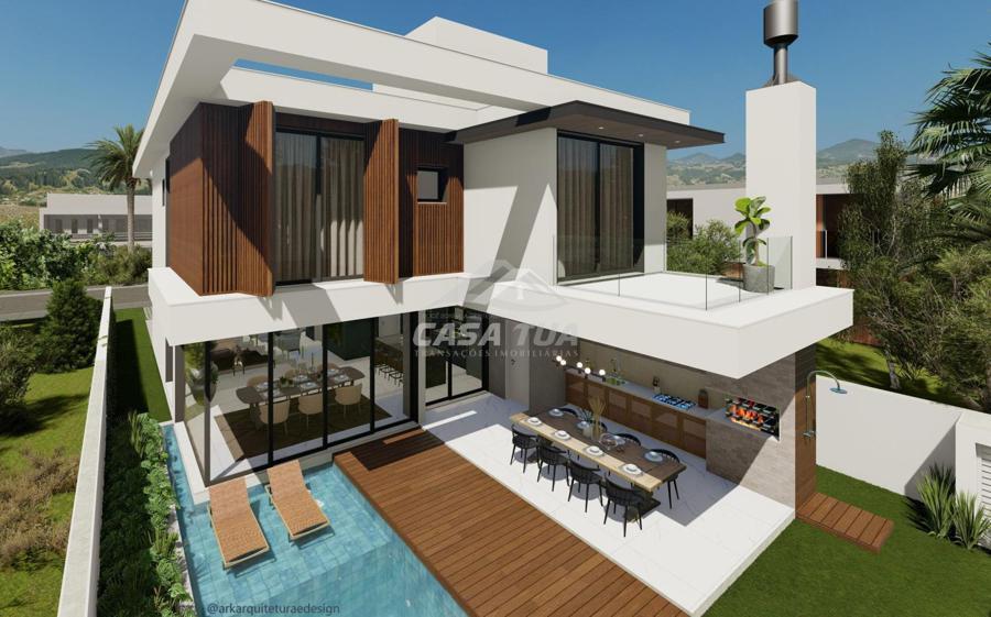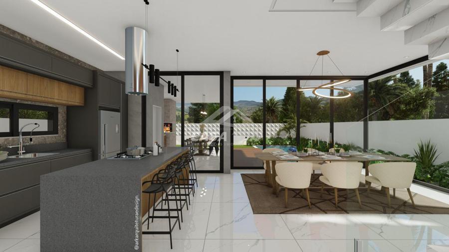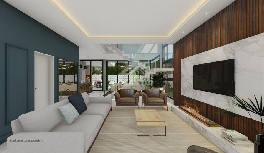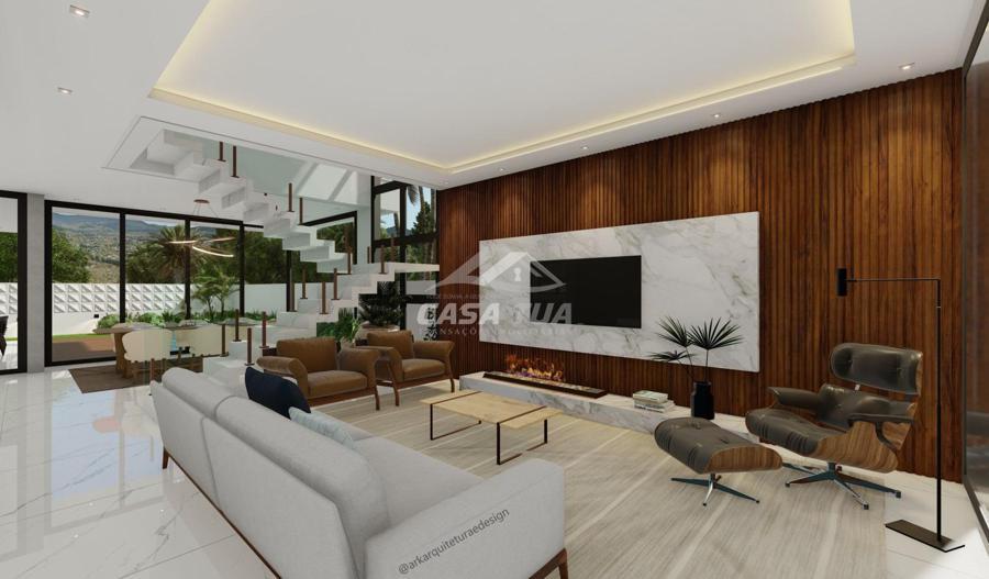 fachada. O living integrado proporciona uma sensação de conforto e amplitude, cozinha, sala de estar, amplo espaço gourmet com churrasqueira, lavabos, escritório, deposito e lavanderia. Possui 05 suítes, sendo 01 master e locker. Em sua área externa, piscina com deck e jardins. Garagem para 3 carros cobertos. Diferenciais construtivos  Tijolo 14x19x29 cm, possibilitando conforto termoacústico condizente ao alto padrão das edificações, Esquadrias externas produzidas pela grife Sierra Móveis, aberturas internas em HDF. Sistema a vácuo de aquecimento de água com boiler para consumo interno. Automação nos