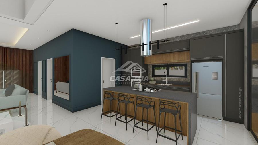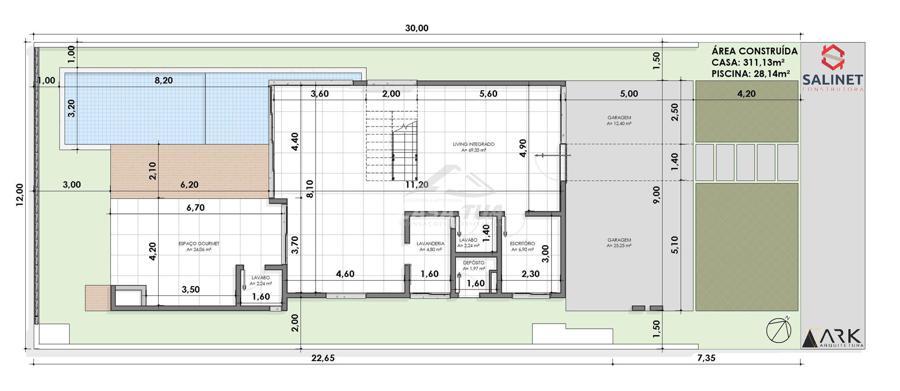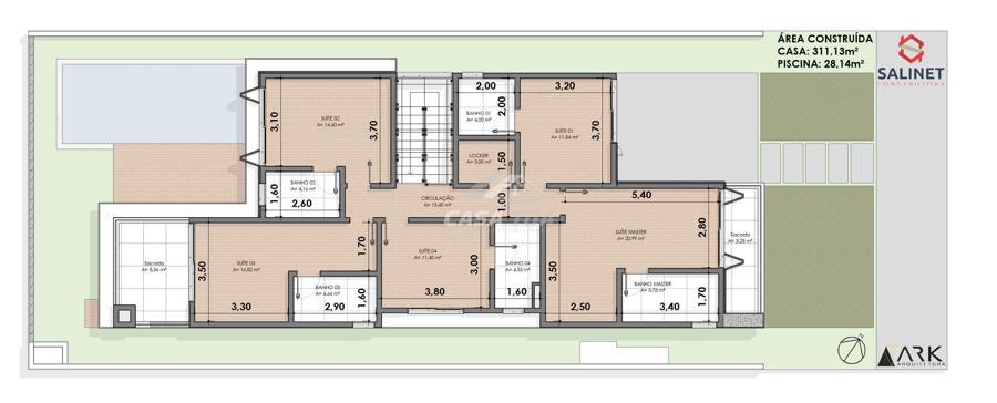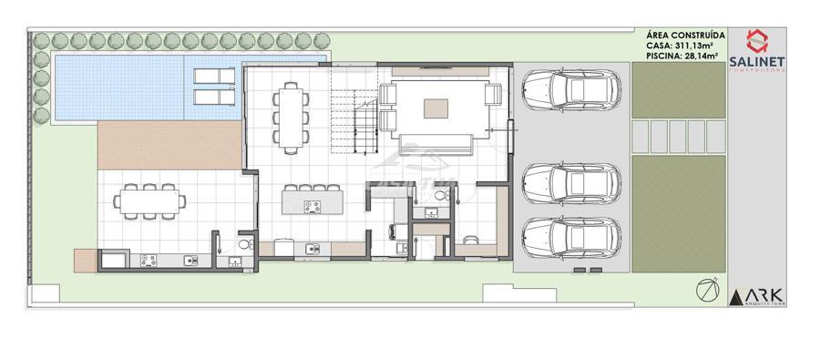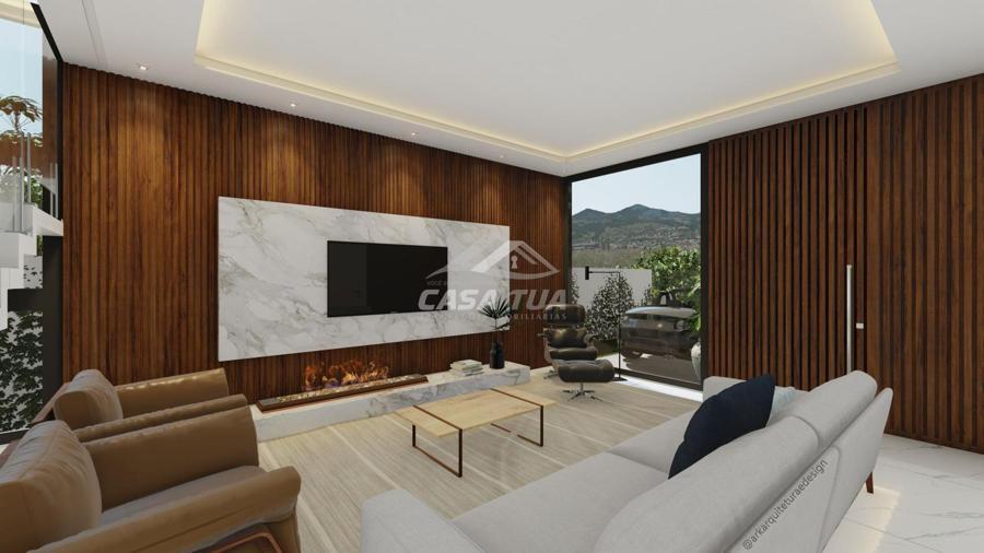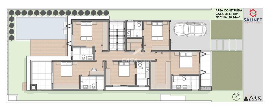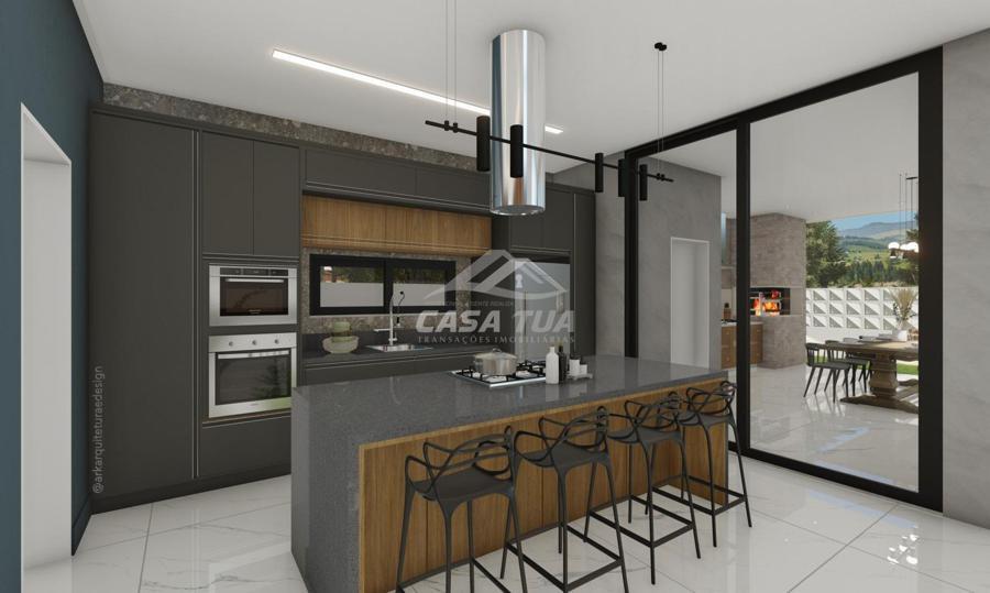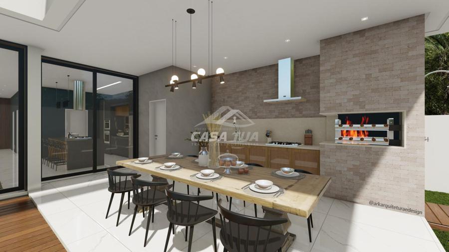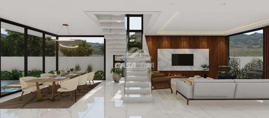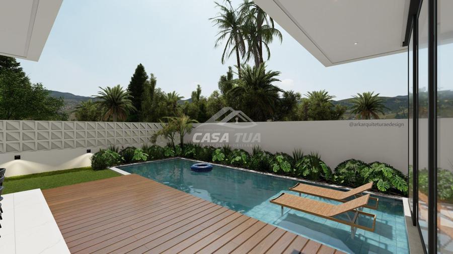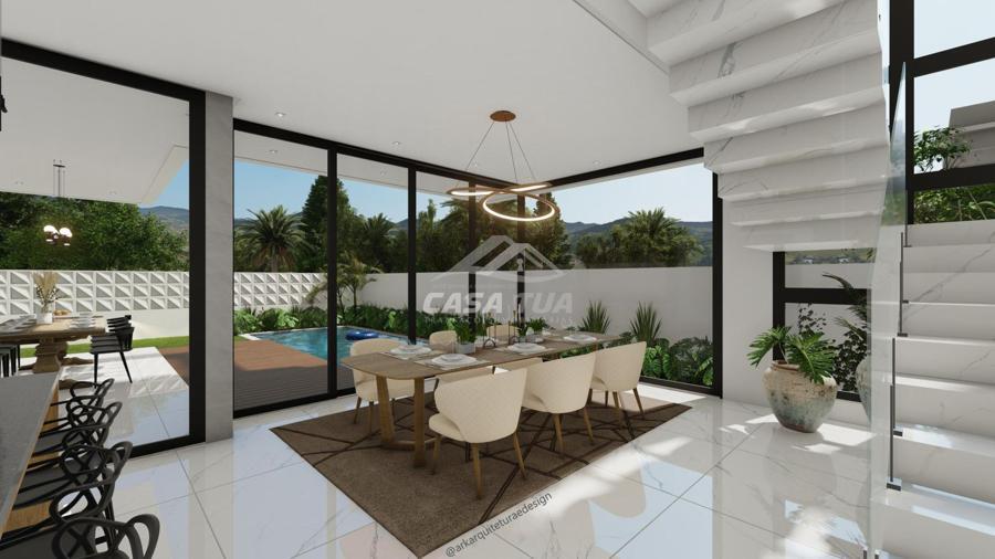 fachada. O living integrado proporciona uma sensação de conforto e amplitude, cozinha, sala de estar, amplo espaço gourmet com churrasqueira, lavabos, escritório, deposito e lavanderia. Possui 05 suítes, sendo 01 master e locker. Em sua área externa, piscina com deck e jardins. Garagem para 3 carros cobertos. Diferenciais construtivos  Tijolo 14x19x29 cm, possibilitando conforto termoacústico condizente ao alto padrão das edificações, Esquadrias externas produzidas pela grife Sierra Móveis, aberturas internas em HDF. Sistema a vácuo de aquecimento de água com boiler para consumo interno. Automação nos